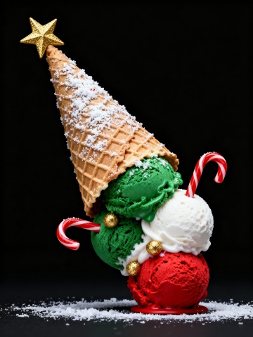3D风与重拟物结合,面包片拼贴成圣诞树,点缀糖果与金星,喜庆甜蜜中透出趣味感,节日氛围浓厚。