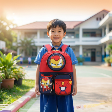 制作这个儿童书包的图,一个6岁的泰国学生背着这个书包,在学校里,阳光灿烂,比例 「1:1」