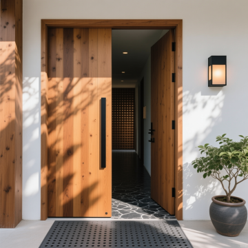 主色调:以白色墙面 + 浅木色地板为主,搭配黑色家具(玄关柜)和自然材质(藤编元素),色调柔和不杂乱。