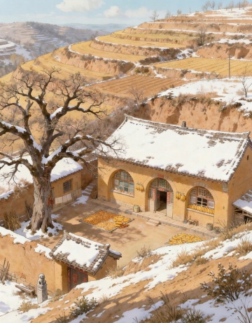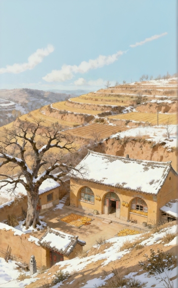 工笔风插画,融合水墨与水彩质感,展现古朴土楼环绕紫藤花树的温馨场景,人物互动充满故事感,传递中式古典与质朴生活之美。