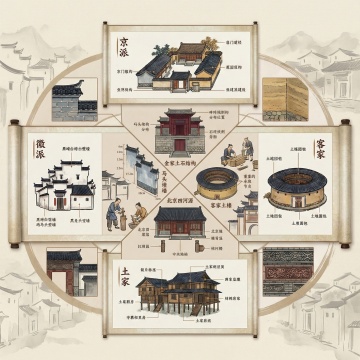 撕纸风中式土楼,层叠山峦与云霞交织,融合古典美学与微缩艺术,呈现静谧唯美的虚拟自然意境。