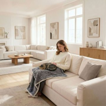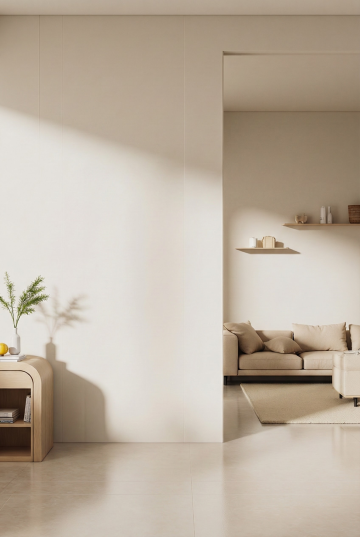 明亮柔和的自然光洒满整个空间,采用极简北欧风格设计,以米白色、浅木色和原木色为主色调,温暖而治愈的氛围。画面中展示的是一个变换了不同家具环境的客厅,整体构图保持对称美学与开放式布局,光线从左侧窗户斜射进来,在浅色木地板和条纹地毯上形成清晰的光影层次。墙上挂着两幅简约线条的植物装饰画,搭配原木边框。左侧有一盏弧形黄铜落地灯,灯光柔和,旁边摆放着一盆绿植。中央是一张浅灰色布艺沙发,搭配几个不同纹理的浅色系靠垫,沙发前是一张原木色茶几,上面整齐摆放着几本书籍和一个小巧的陶瓷花瓶。整体画面质感细腻,线条简洁流畅,空间通透,营造出舒适、宁静且温馨的居家氛围。