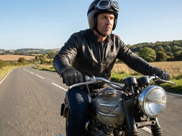 赛博朋克风夜景中,骑手疾驰于未来都市,金属质感机车与霓虹光影交织,头盔静置路面,虚实交错,科技感与酷炫感并存。