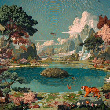 水彩风插画,梦幻清新,虚拟自然中荷叶与金鱼共舞,小舟悠然。