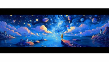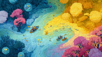Aerial view of a Dopamine Valley, a rainbow river of flowing liquid light winds through fantastical biomes. Bright yellow area with trumpet-shaped glowing flowers, magenta trees with crystal fruits, neon blue grass. Tiny figures in transparent boats rowing, oars stirring up colored light particles. Colorful soap bubbles floating in air with miniature seasons inside. Whimsical, joyful, maximalist color palette, impressionistic brushwork, art by Yellena James and Petra Eriksson. --ar 16:9