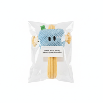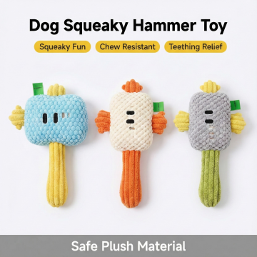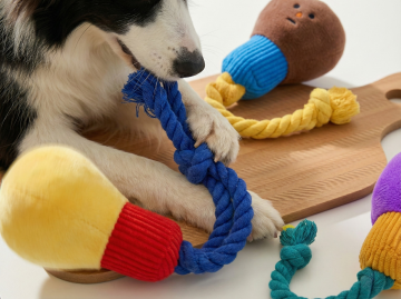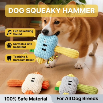 雪纳瑞撕扯方案:雪纳瑞用嘴撕扯锤柄绳结,耳朵竖起,白色简约背景突出耐咬材质与发声孔设计