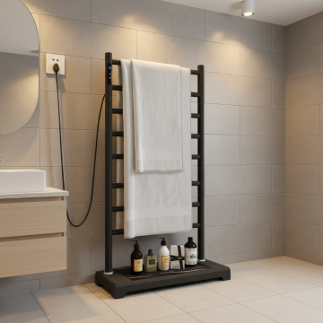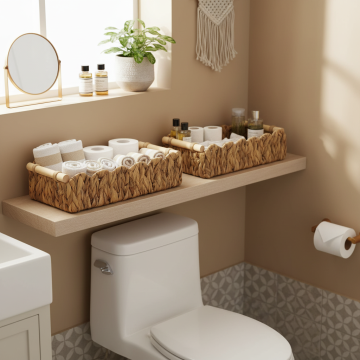 极简主义风格的卫生间室内设计,整体采用米白色与浅木色的柔和配色方案,温暖的嵌入式灯带与顶部筒灯提供均匀柔和的照明,营造明亮通透的氛围。墙面和地面铺设大块浅色哑光瓷砖,线条简洁流畅。不同场景下的卫生间摆设:有的配备悬挂式白色洗手台,台面整洁,搭配简约白色水龙头,上方是带储物功能的镜柜,旁边装有黑色金属毛巾架;有的设置独立玻璃淋浴房,内部有壁龛收纳洗浴用品,黑色淋浴喷头与五金件形成精致对比;有的墙面悬挂线条简约的黑白花卉装饰画,下方嵌入木质灯带壁龛,摆放香薰和装饰摆件;有的空间内放置智能马桶,旁边设有带木质搁板的收纳区。整体设计注重功能性与美学的平衡,空间布局合理,细节处理精致,呈现出现代、干净、舒适的卫生间环境。