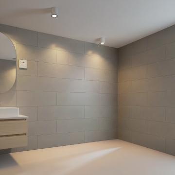 极简主义风格的卫生间室内设计,柔和的米白色与浅灰色调为主,整体明亮通透,自然光透过隐形光源均匀洒入,营造出干净、宁静、高级的氛围。浴室中央是悬挂式米白色洗手台,台面光滑整洁,台上放置简约设计的水龙头和几瓶透明瓶装洗漱用品,台下有隐藏式抽屉和开放式储物格,内置叠放整齐的毛巾与洗漱用品。洗手台上方是带LED灯带的长方形镜面柜,柜内隐约可见折叠整齐的毛巾,镜面清晰映照出浴室景象。右侧是白色壁挂式马桶,线条流畅。左侧为透明玻璃淋浴房,内部有简约的置物架和手持花洒。墙壁采用大块浅色瓷砖铺设,地面是光滑的白色大理石瓷砖,整体空间布局紧凑有序,功能分区明确。金属色毛巾架上挂着白色毛巾,与整体色调和谐统一。设计注重空间的简洁性与功能性,无多余装饰,强调材质本身的质感与光影的细腻变化,呈现出现代、简约、舒适的卫浴空间。