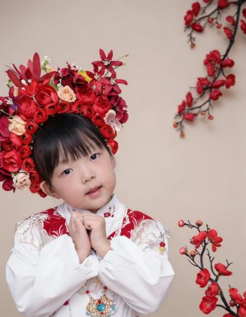 粉色系中式童趣插画风,融合双重曝光与水彩质感,刺绣元素点缀裙摆,梦幻马影环绕,传递甜美可爱与节日喜庆。
