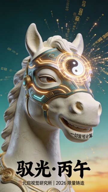 未来感与中式美学交融,3D重拟物风格呈现科技马首,鎏金金属质感搭配太极光效,虚拟现实元素点缀,国潮风设计致敬丙午年。