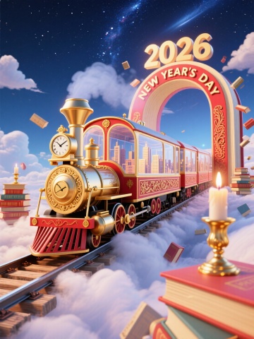 票根框景式构图:画面中心是一只手手持巨大的浅蓝色票根(印 “2025 过去→2026 未来”字样),红白色列车行驶在石拱桥的画面从票根框穿过;背景是暖橙渐变天空,点缀烟花、软云,桥边有绿植、红灯笼,桥下河道载有小船,整体营造新春氛围。色彩以暖橙、红、浅蓝为主,色调明亮温暖;风格是治愈系 3D 卡通渲染风。