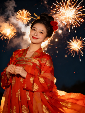 服装:红色高定抹胸婚纱,带有精致的蕾丝边和珍珠装饰,裙摆为渐变红白色层层堆叠的超蓬松大裙摆,有细腻的光泽,