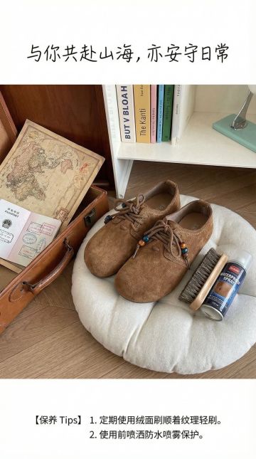 图: 将主推的2个颜色(棕色 杏色)的鞋子,分别放在不同的质感背景上(麻布、粗糙纸张、毛毡)并列展示。 文案: “低饱和度的生活提案” + 色卡名称。