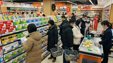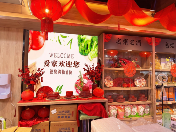 实景感药店场景,融合促销与喜庆元素,扁平化视觉呈现,杂志风布局,印刷质感突出,传递药店活动氛围。