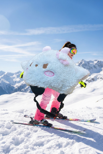 年轻时尚的亚洲女性模特(20-25岁),笑容灿烂,穿着浅蓝色修身滑雪服+白色滑雪裤,搭配黑色防风手套与深色滑雪镜,脚踩白色专业滑雪板,站立于阳光明媚的雪山雪道上,背景为纯净蓝天、远处缆车与松软积雪。模特佩戴的白色毛绒动物造型滑雪头盔帽套需100%还原原产品:蓬松白色毛绒材质,蓝色小耳朵、粉色腮红、蓝色眼睛细节清晰可见,头盔比例协调自然,不显臃肿。整体画面采用高清8K分辨率,自然光线打亮产品,营造时尚活力的雪场出片氛围,突出可爱个性设计,适合社交媒体分享,背景简洁不抢镜,产品主体占比60%以上,精准匹配年轻滑雪人群追求的潮流感与拍照需求。