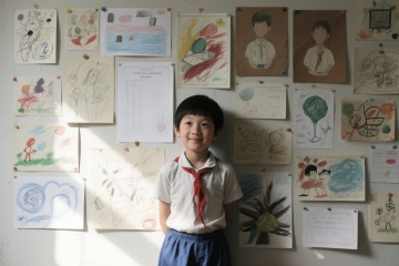孩子站在一面贴满自己各类“作品”的墙前(有完美的,也有不完美的涂鸦、手工、成绩单等),面带思考或平静的微笑。