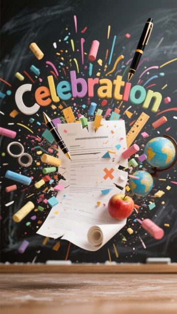 黄昏逆光视角,一间被夕阳染成琥珀色的废弃教室,曾经整齐的木质课桌椅如今以各种角度倾斜散落,几张翻倒的椅子腿指向天花板,墨绿色黑板上数学公式被雨水冲刷得斑驳模糊,露出底下学生用白色粉笔偷偷画的褪色宇航员。教室后方的黄色书柜已倾颓半壁,书籍如瀑布般倾泻在地板上,几页残破的书页被穿堂风卷起,在斜射的金色光束中飘舞。窗框上的玻璃大多碎裂,只有一块还顽强地反射着最后一抹残阳,空气中悬浮着尘埃与细小的纸屑,墙角蛛网在光影中如同精致的蕾丝装饰。