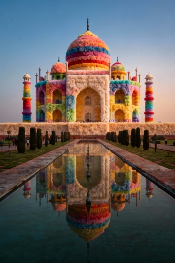 梦幻感与国潮风交融,中式古塔以毛发生长风呈现彩虹色,重拟物与浮雕设计凸显喜庆卡通感,传统建筑焕发奇幻新貌。