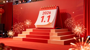 3D重拟物风格日历立于阶梯之上,国潮红金配色,粒子烟花绽放,喜庆迎新,元旦氛围浓厚。