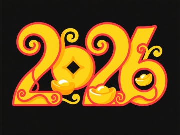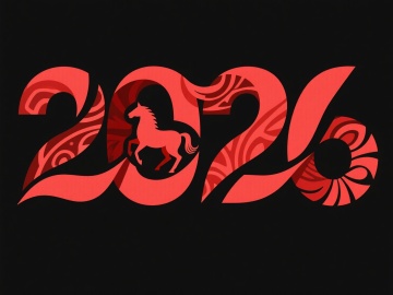 ”2026“渐变红金艺术字,数字笔划呈烟花绽放形态,转角处嵌迷你骏马浮雕,黑底