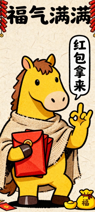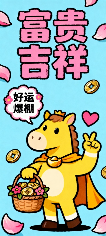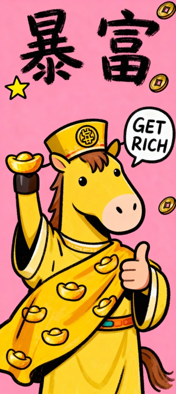 卡通潮酷手绘风格,Q 版 “马财神” 形象,整体为黄色主体,头戴镶玛瑙的紫金财神冠,身披印满铜钱串纹样的红色绸缎披风,一只蹄子托举聚宝盆,另一只蹄子比出 “招财进宝” 的作揖手势;形象旁带云朵状对话框,框内写 “恭喜发财”;背景为渐变橙红色,画面顶部用毛笔书法艺术字写 “财运亨通” 四字;画面四角点缀红色小灯笼和金色元宝装饰元素;整体线条粗犷有手绘质感,红金双色撞色鲜明,充满新年传统喜庆氛围,突出 Money God(财神)的招财属性。