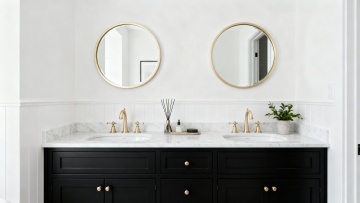 温馨现代浴室场景,自然光灯光,圆圆的月亮形状壁灯安装在墙上,发出柔和光芒照亮整个空间。画面右侧有一双手正在洗手池前洗手,洗手池为白色陶瓷材质,水龙头为银色金属质感。洗手池左侧放置着一个白色杯子,里面插着牙刷。背景中可以看到木质柜子和镜子的一部分。整体色调温暖舒适,营造出宁静放松的氛围。"