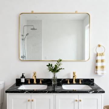 极简主义风格浴室,整体以纯净的白色为主色调,搭配温暖的原木色人字拼地板,营造出明亮、洁净、宁静的氛围。柔和的自然光从画面外洒入,在白色墙面上形成微妙的光影过渡,光线均匀柔和,阴影细节自然。空间布局改为开放式淋浴区与独立式浴缸分区设计,浴缸更换为带有金属支架的椭圆形亚克力材质,置于房间中央位置,旁边增设一个原木色置物架。墙面采用大块哑光瓷砖铺设,局部嵌入浅灰色石质壁龛用于收纳洗漱用品。悬挂式白色洗手台下方设计成开放式储物格,搭配黑色金属水龙头和圆形镜子。天花板安装两盏黑色半球形吊灯,提供主要照明。浴室内摆放简约线条的原木色收纳柜和绿植装饰,毛巾和洗漱用品保持整齐摆放,整体视觉层次分明,信息传达简洁高效,符合现代都市人群对简约生活美学的追求。