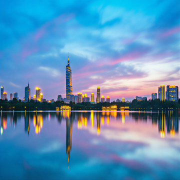 上海陆家嘴天际线全景,以东方明珠电视塔为视觉中心,周围环绕着现代化高楼大厦,黄昏时分,天空呈现从深蓝到粉紫渐变的绚丽色彩,云彩被染成柔和的粉紫色,城市建筑灯火初上,部分楼宇亮着黄色暖光,平静的水面倒映着整个城市景观,形成完美对称的镜像效果,水面如镜面般光滑,反射出天空和建筑的色彩与细节,整体氛围宁静而壮丽,具有高度写实的摄影质感,清晰的细节,高对比度,柔和的光线,专业的城市风光摄影风格。