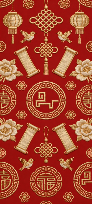 中式古典风格,鎏金描边线条勾勒传统元素,剪纸风单色设计,融合灯笼、扇子、祥云与福字,喜庆复古,尽显节日韵味。