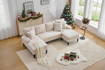 为这款沙发脚蹬多生成几张场景图可以加一些圣诞元素在里面,脚蹬可以放在电视机前面当茶几摆放书籍遥控器等物品以及可以给人当休息的脚蹬;或者坐在沙发上时,将脚放在脚蹬上,彻底放松双腿, • 临时“贵妃榻”:将脚蹬与沙发座位并排或呈直角放置,可以瞬间组合成一个临时的躺椅或“贵妃榻”,用于小憩或慵懒地看书刷剧。 根据要求生成5张不一样的图片