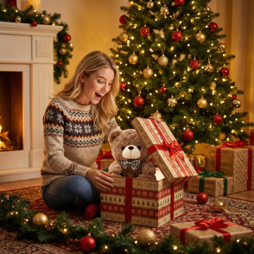 毛绒质感的手账书堆叠,搭配木质铅笔,暖光圣诞树背景,营造温馨复古的冬日文艺氛围。