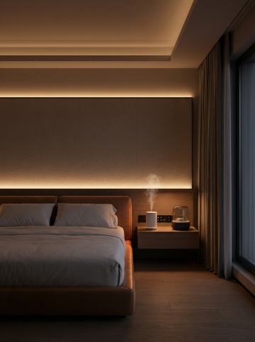 全景视角,高清画质,3:4比例。一间现代简约风格的豪华酒店卧室,视角正对床头与背景墙。环境光线极暗,仅由暖黄偏红光(色温1250K,照度低于10lux)勾勒轮廓。光线主要来自:1. 床头背景板上方一条细长的间接洗墙灯带,发出柔和均匀的漫射光;2. 天花板凹槽内隐藏的灯带提供基础环境照明。床头柜上放置着一台设计精致的迷你香薰机(类似无印良品风格)和一个有质感的织物面小型音响。床头柜表面集成了一块极简