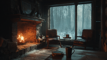 3D重拟物风,油画质感渲染冬日木屋暖炉场景,光影交织营造静谧温馨氛围,质朴家具与窗外雪林呼应,尽显舒适与宁静的节日气息。