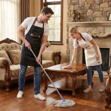 以图中的清洁工具袋为元素,欧美女人打扫卫生,适用于家庭、汽车、花园、工艺品,物体主体特征不变,设计6张跟清洁工具袋有关的图,可以适当加一些英语文案点缀一下,比例 「16:9」