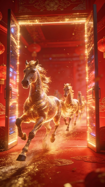 鎏金骏马踏云而行,水墨山水为幕,红云缭绕,国潮风韵中融古典与梦幻,展现东方奢华之美。