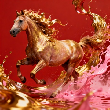 梦幻水彩风插画,色彩流动的骏马象征新年好运,虚实交融的自然意象,唯美呈现“马上发财”祝福。