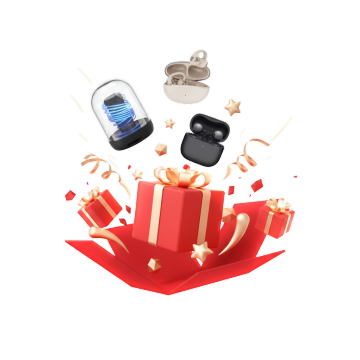 现代感与科技感交融的3D风设计,金属质感耳机置于蓝调礼盒中,重拟物风格凸显商务精致,搭配丝带营造节日氛围。