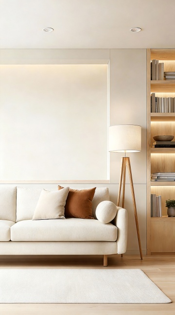 极简主义风格客厅场景,主体为造型前卫的模块组合式浅灰色布艺沙发,线条流畅利落,搭配几个几何形状的同色系靠垫与一个橙色抽象图案抱枕,沙发下方是浅灰色纹理地毯,前方为黑色细腿圆形小茶几,上面摆放简约装饰品。背景墙为米白色,悬挂一幅线条简约的抽象人物轮廓装饰画,左侧有一扇装有半透明白色纱帘的窗户,右侧角落放置一盆大型绿植增添生机。顶部悬挂一盏黑色金属质感吊灯,柔和的自然光与室内灯光交织,营造出温馨、宁静、高级且充满现代设计感的氛围,整体色调以灰白为基础,点缀少量橙色,光影层次丰富,空间通透,材质表现细腻。