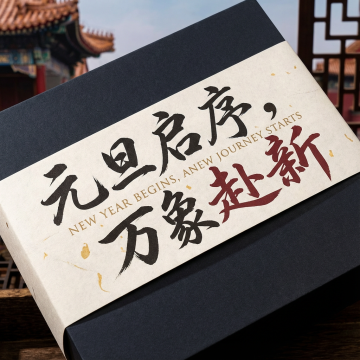 生成一张腰封,长条形的,主题为“元旦启序,万象赴新”,用于礼盒上,礼盒是方形的磁吸套盒,字体采用国潮风格,大气豪迈,大师作品,字体错落摆放,不要规整的罗列,搭配主题英文,英文字体要宋体