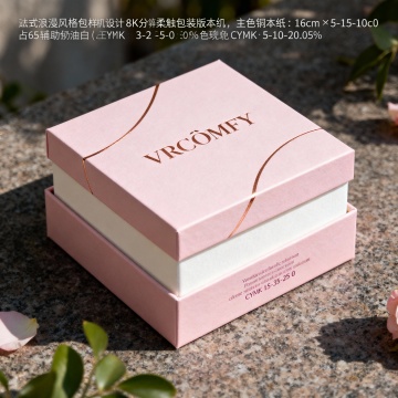 长16cm宽16cm高9cm square box packaging, French romantic style for European and American markets, main color is low-saturation pale pink (CMYK:5-15-10-0) accounting for 65%, secondary color is cream white (CMYK:3-2-5-0) accounting for 30%, accent color is rose gold (CMYK:5-10-20-0) accounting for 5%, box body made of soft-touch coated paper, brand name 'VRCÔMFY' printed with rose gold hot stamping 工艺,product information in deep pink (CMYK:15-35-25-0) using elegant sans-serif font, box lid with subtle curved line decoration in rose gold, inner lining of the box is cream white, delicate texture, romantic and gentle atmosphere, vector-based design, print-ready.