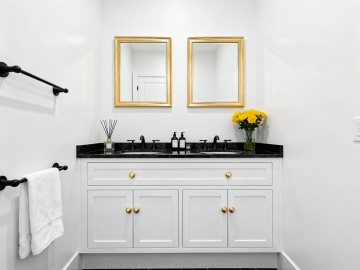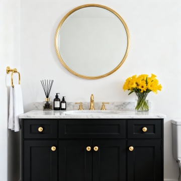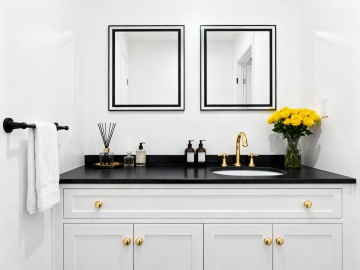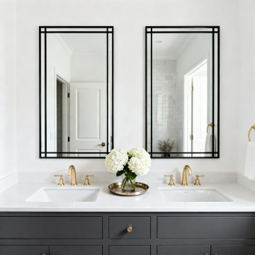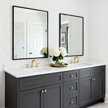 核心元素:墙面挂着两块黑色窄边框浴室镜(是当前常见的免打孔 / 壁挂款),下方是双洗手台 + 深灰色柜体,台面是白色大理石纹理材质。