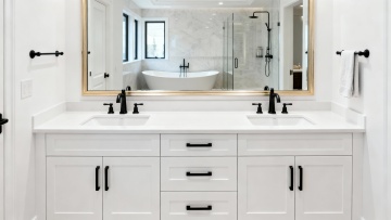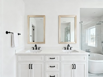 现代简约风格的双台盆浴室装修效果图,整体色调以黑白灰为主,搭配细节装饰显得干净高级: