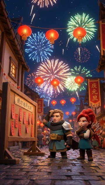 软3D风格插画,融合国潮元素与卡通感,雪夜烟花绽放,红灯笼高挂,孩童嬉戏屋檐,温馨喜庆的春节氛围扑面而来。
