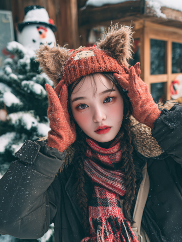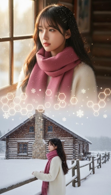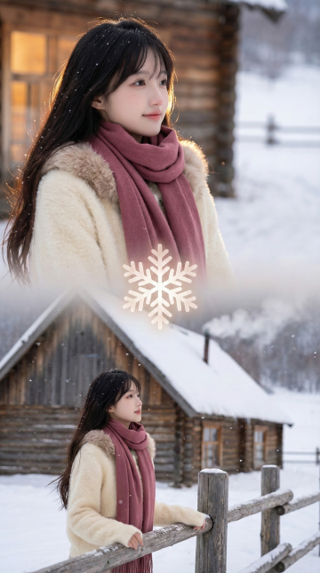 采用近景特写(3:4比例),透过玻璃窗拍摄(带轻微反光质感);滤镜是暖调柔光风,提亮肤色同时保留雪景的清透感,强化冬日温馨氛围。