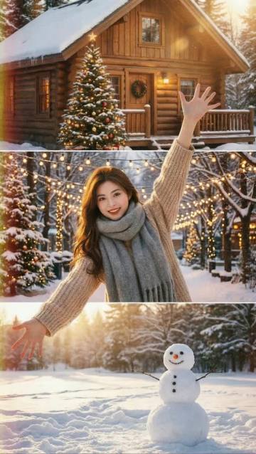 室外被雪覆盖的圣诞树+木屋门窗,右侧有雪人装饰,背景带冬日积雪,营造圣诞雪景氛围。