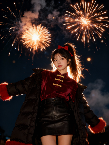 黑色羽绒服+红格纹围巾+红色露指手套,圣诞红配色呼应节日氛围。