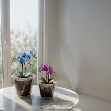 3D渲染风格的现代简约客厅,从不同角度展现的室内场景,柔和明亮的自然光从大窗户洒入,形成温暖的光影效果和清晰的阴影细节,浅色木地板搭配米白色地毯,宽敞的浅灰色L型沙发上摆放着白色和浅蓝色靠垫,沙发前是浅色木质茶几,上面有简约的装饰品,背景墙为纯净的白色,一侧有木质置物架摆放着小型装饰画和绿植,另一侧是大型绿色植物增添生机,整体采用清新淡雅的配色方案,房间内的家具摆设布局经过精心设计,呈现出舒适、整洁、通透的居住氛围,具有高级的空间感和设计感。