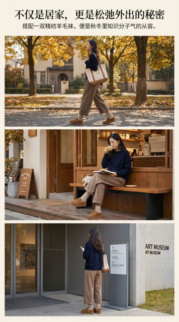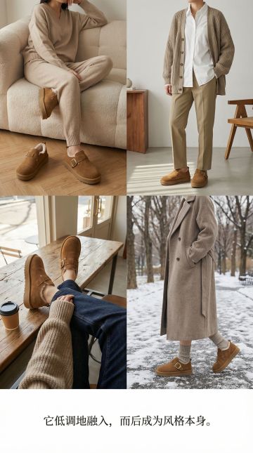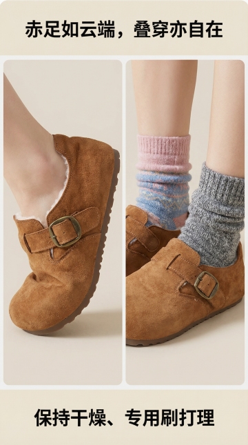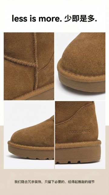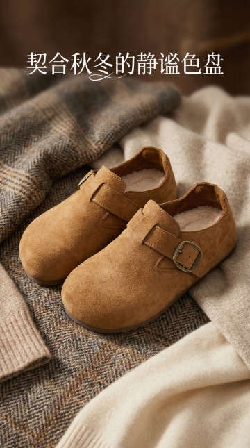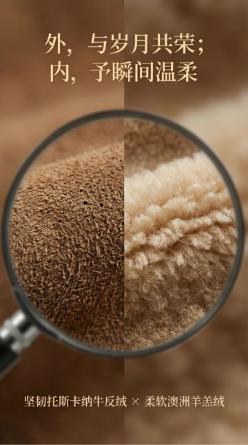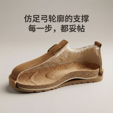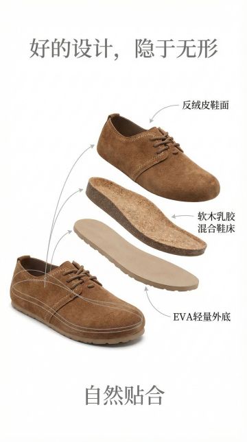 图: 冷静的剖面示意图。清晰展示“牛反绒层-缓冲层-羊羔绒层-软木乳胶鞋床”的复合结构,用箭头或温和的色彩标注暖意留存区域。 文案: “温暖,是一门科学” + “锁温结构”、“透气平衡”、“足弓承托”