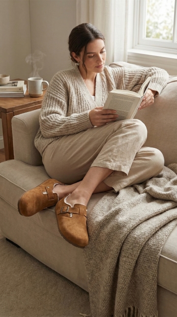 明亮柔和的自然光洒满整个空间,采用极简北欧风格设计,以米白色、浅木色和原木色为主色调,温暖而治愈的氛围。画面中展示的是一个变换了不同家具环境的客厅,整体构图保持对称美学与开放式布局,光线从左侧窗户斜射进来,在浅色木地板和条纹地毯上形成清晰的光影层次。墙上挂着两幅简约线条的植物装饰画,搭配原木边框。左侧有一盏弧形黄铜落地灯,灯光柔和,旁边摆放着一盆绿植。中央是一张浅灰色布艺沙发,搭配几个不同纹理的浅色系靠垫,沙发前是一张原木色茶几,上面整齐摆放着几本书籍和一个小巧的陶瓷花瓶。整体画面质感细腻,线条简洁流畅,空间通透,营造出舒适、宁静且温馨的居家氛围。