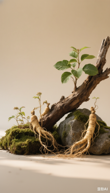 一张具有高度写实摄影风格的中药主题海报,主色调为温暖的棕黄色和土褐色,营造出古朴、自然、沉静的氛围。画面采用柔和的侧逆光,光线从左上方照射,在主体中药上形成明显的高光和细腻的阴影,增强立体感和质感。构图遵循三分法,主要物体集中在画面偏下位置,背景有浅景深的模糊处理。主体为一株完整的、形态饱满的人参,带有长长的须根,放置在一块粗糙的木质树桩切片上,树桩旁有一根横向的枯木枝干。人参旁边散落着几片切好的黄色药材薄片,一小撮干燥的绿色草药,以及一张泛黄的、上面有模糊文字的古老纸张,纸张上也放置了少量药材。背景替换为云雾缭绕的远山,山峰轮廓柔和,呈现出淡褐色调,与前景的中药元素和谐统一,整体画面质感细腻,细节丰富,光影过渡自然,传递出传统中医药的深厚底蕴与自然草本的纯净感。